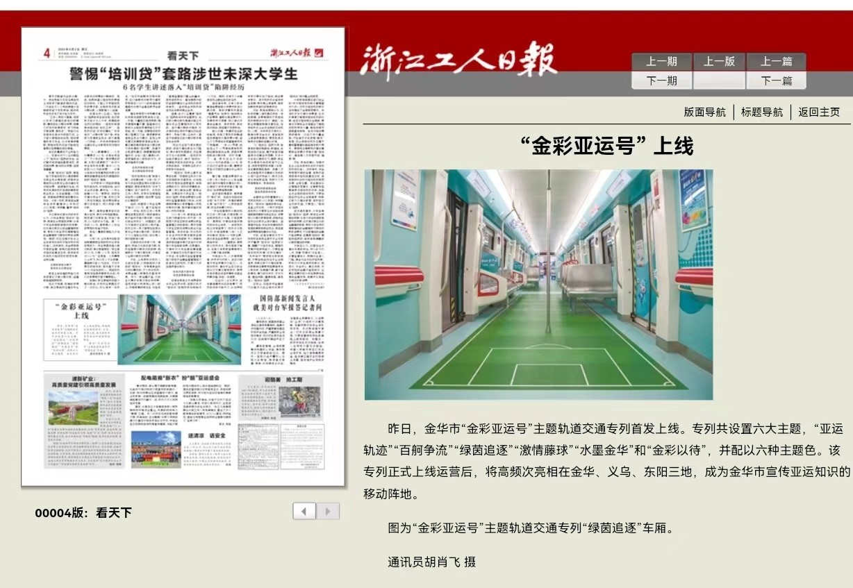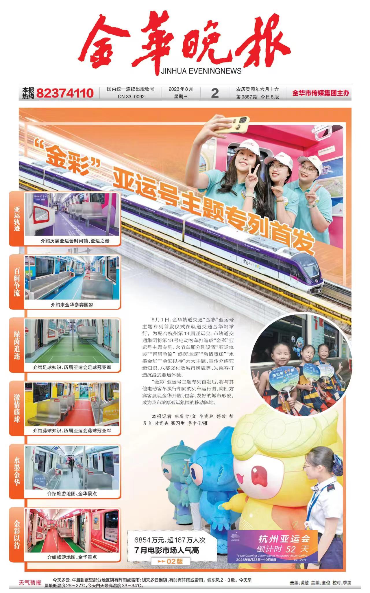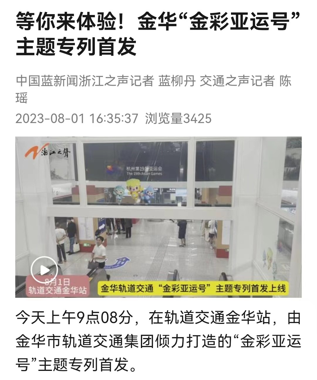 8月1日上午9點(diǎn)08分,由市軌道交通集團(tuán)傾力打造的“金彩亞運(yùn)號(hào)”主題專(zhuān)列首發(fā)上線。身披醒目虹韻紫的“金彩亞運(yùn)號(hào)”主題專(zhuān)列一經(jīng)面世,就受到了社會(huì)各界的廣泛關(guān)注。